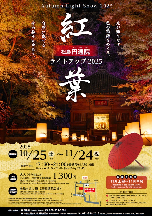 夜は円通院を含めた松島の名所がライトアップされ、幻想的なお寺の中に色鮮やかな紅葉の赤色が華やかさを与えます。